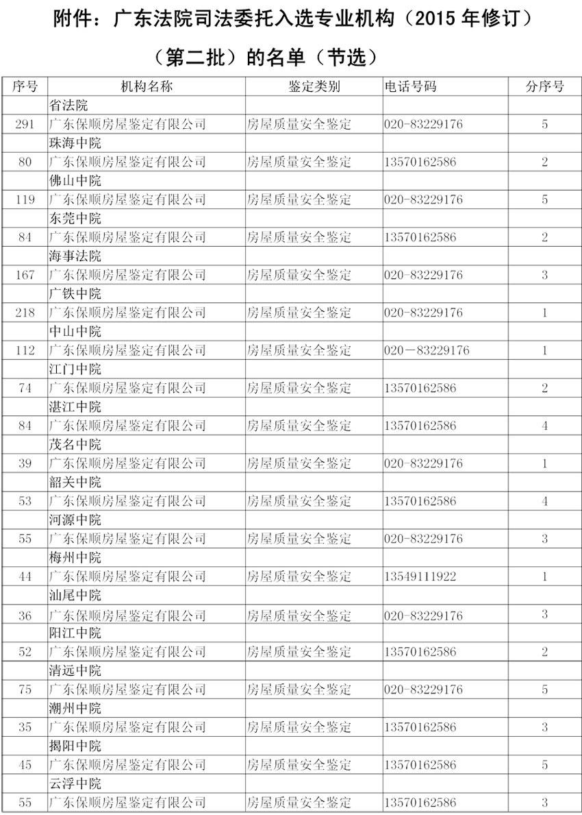 按照粵高法[2015]114號(hào)《廣東法院司法委托入選專業(yè)機(jī)構(gòu)(2015年修訂)的基本條件》,經(jīng)過(guò)法院審查核實(shí),廣東保順檢測(cè)鑒定有限公司順利入選“中山中級(jí)法院”司法委托專業(yè)機(jī)構(gòu)名錄。