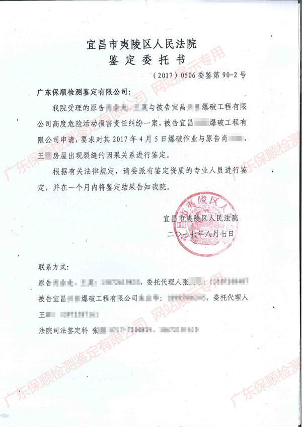 由宜昌市夷陵區人民法院審理的肖**、王*與宜昌**爆破工程有限公司糾紛一案中,因案情需要,受宜昌市夷陵區人民法院的委托,我司對王*房屋出現裂縫的因果關系進行房屋鑒定。