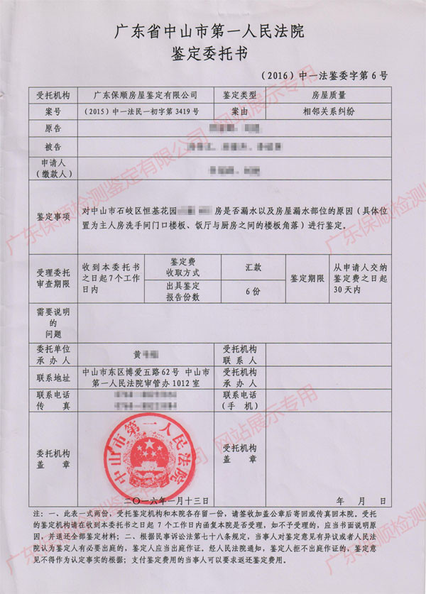 由中山市第一人民法院審理的原告李**、劉*與被告劉**、劉**、李**財產損害賠償糾紛一案,因案情需要,受中山市第一人民法院的委托,廣東保順檢測鑒定有限公司對中山市恒基花園*棟是否漏水以及漏水部位的原因進行鑒定。