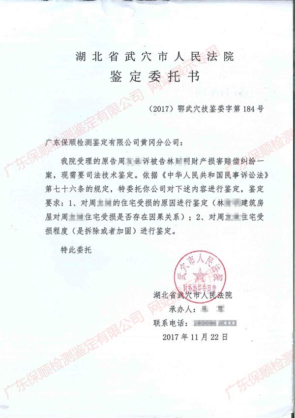 由湖北省武穴市人民法院審理的原告周**訴被告林**財產損害賠償糾紛一案,因案情需要,我司對林**建筑房屋與周**房屋受損是否存在因果關系和周**房屋受損程度(拆除或者加固)進行相關房屋檢測鑒定。