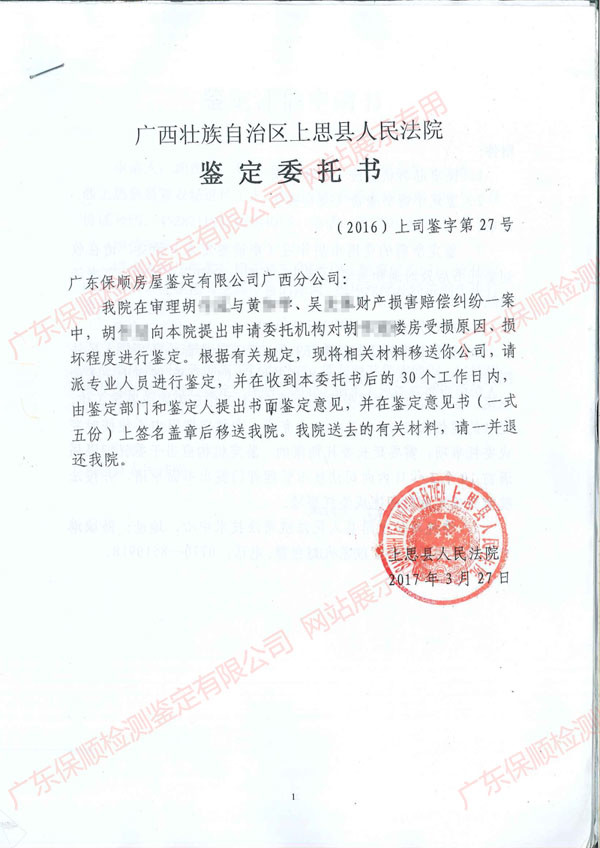 由廣西壯族自治區上思縣人民法院審理的原告胡**與被告黃**、吳**財產損害糾紛一案中,因案情需要,受廣西壯族自治區上思縣人民法院的委托,我司對廣西壯族自治區防城港市上思縣在妙鎮胡**房屋受損原因、損壞程度進行房屋檢測鑒定。