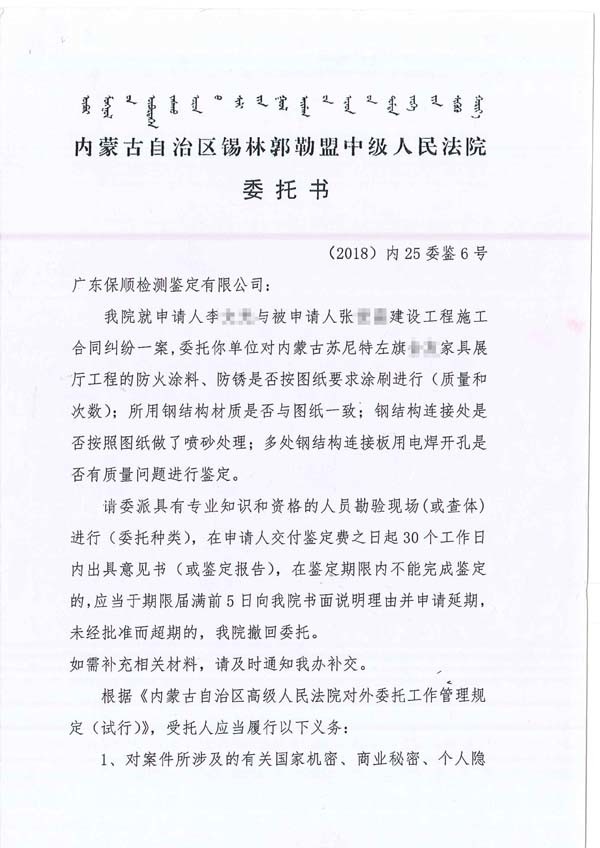 由錫林郭勒盟中級(jí)人民法院審理的(2017)內(nèi)2523民初519號(hào)一案,因案情需要,我司對(duì)涉案房屋鑒定區(qū)域防火涂料、防銹是否按照?qǐng)D紙要求涂刷(只對(duì)是否涂刷及涂層厚度進(jìn)行檢測(cè));所用鋼結(jié)構(gòu)材質(zhì)是否與圖紙一致;鋼結(jié)構(gòu)連接處是否按照?qǐng)D紙做了噴砂處理;多處鋼結(jié)構(gòu)連接板用電焊開孔是否有質(zhì)量問(wèn)題進(jìn)行鑒定。