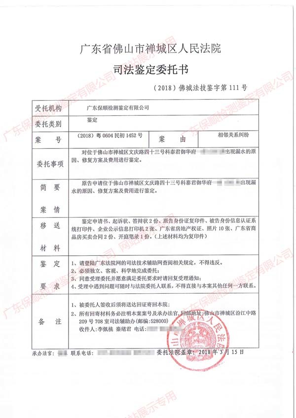 由廣東省佛山市禪城區(qū)人民法院受理的原告李**、趙**訴被告譚**、翟**相鄰關(guān)系糾紛一案,因案情需要,受廣東省佛山市禪城區(qū)人民法院的委托,廣東保順檢測鑒定有限公司對位于佛山市禪城區(qū)文慶路四十三號科泰君御華府**房出現(xiàn)漏水的原因進(jìn)行鑒定。