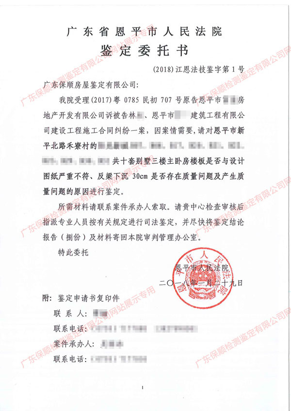 由廣東省恩平市人民法院委托的(2018)平法委鑒字第23號原告恩平市**房地產開發有限公司訴被告林*、恩平市**建筑工程有限公司建筑工程施工合同糾紛一案。因案情需要,受廣東省恩平市人民法院的委托,廣東保順檢測鑒定有限公司派員對恩平市新平北路的十套別墅進行工程質量鑒定。